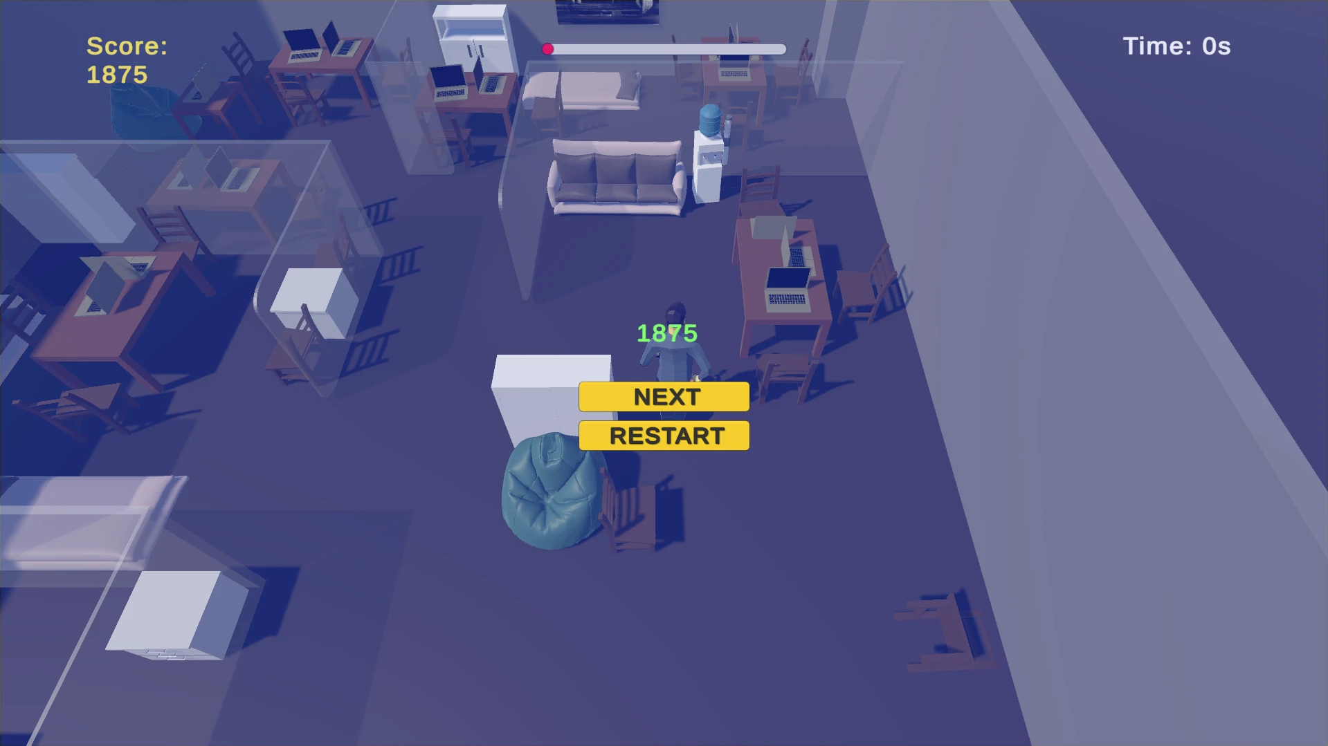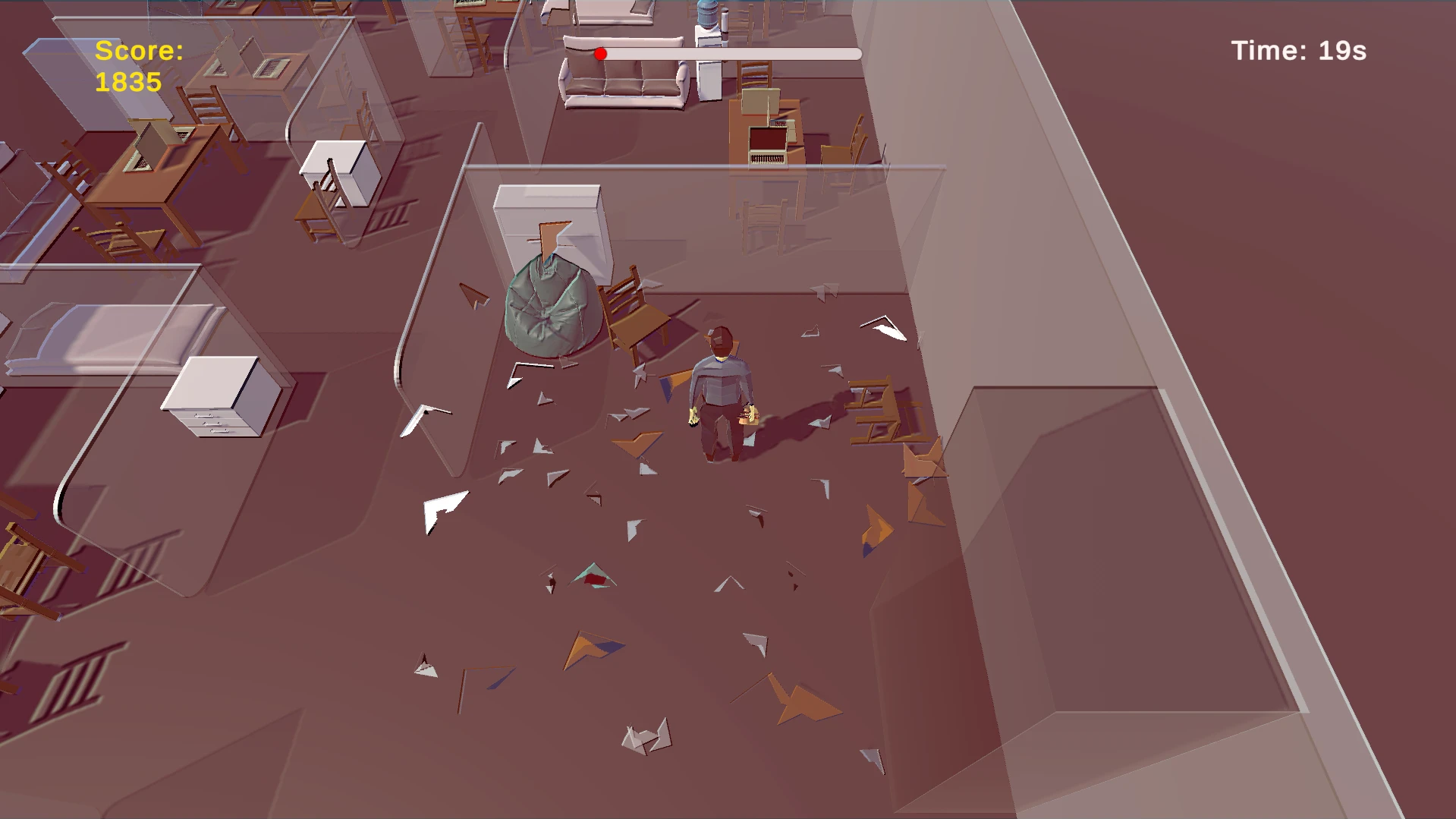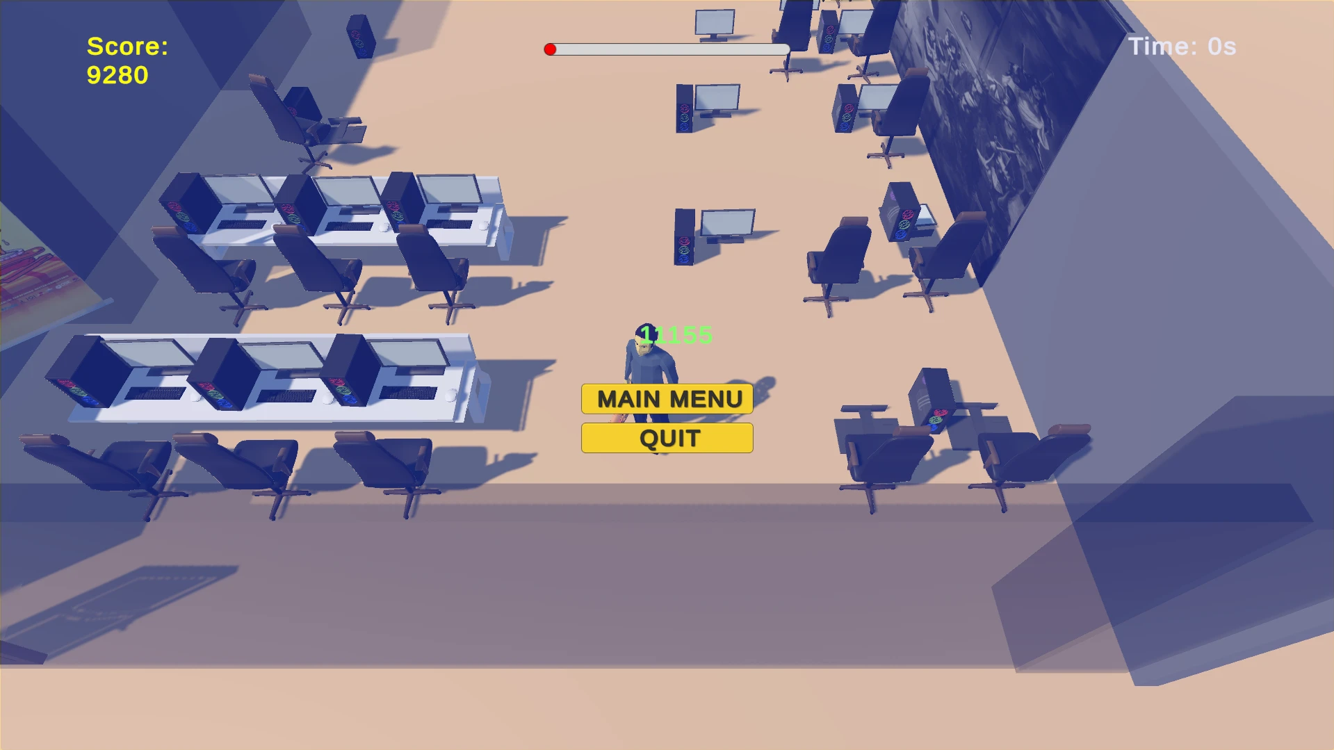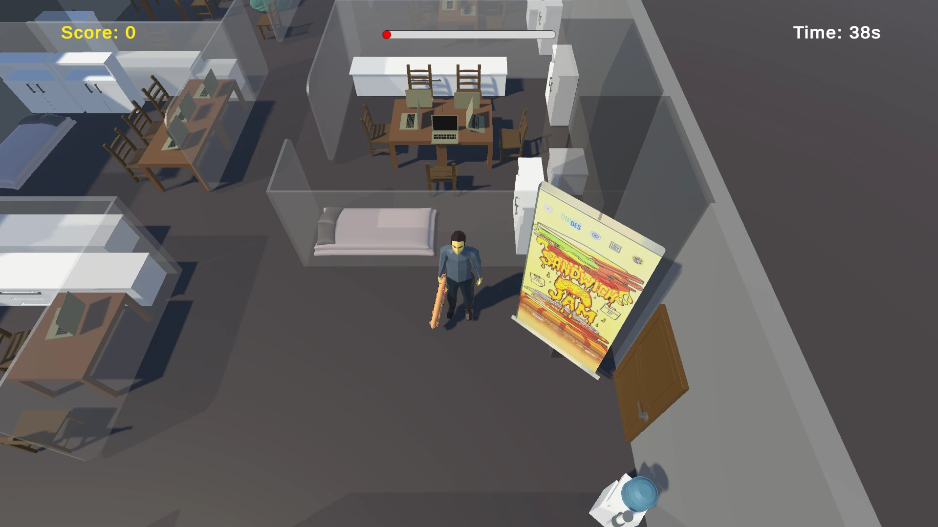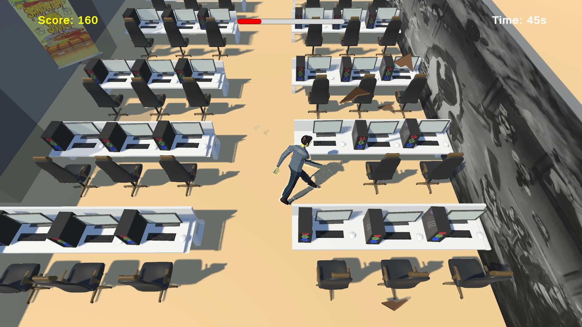 Back to GameJam’de kontrolünü kaybeden bir jammer, ofisteki her şeyi parçalayarak puan toplamaya çalışır.