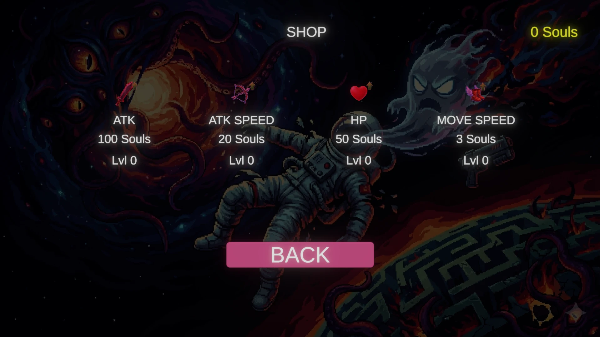 - Shop UI: Players can spend Souls in the Main Menu to upgrade stats.