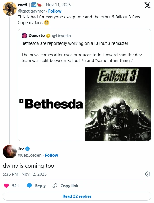 Fallout hayranları uzun süredir New Vegas’ın yeni nesil bir remaster’ını bekliyordu. Bethesda’dan yıllardır hiçbir açıklama gelmeyince umutlar tükenmişti… ta ki ünlü insider Jez Corden bir tweet’te “Merak etmeyin, New Vegas da geliyor” diyene kadar.
