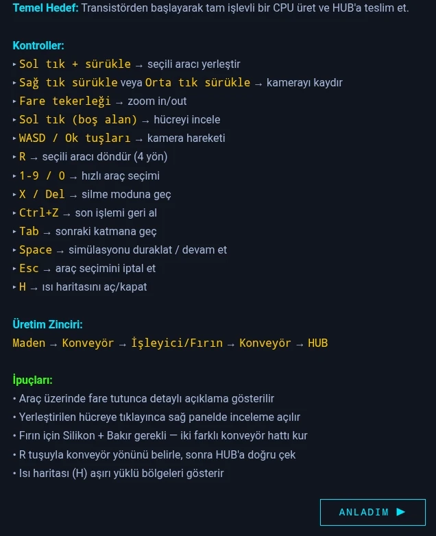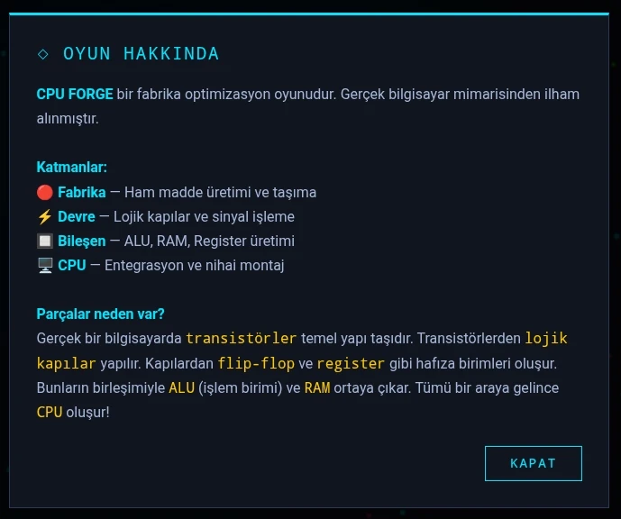 Bilgisayar parçaları üretmek hiç bu kadar sürükleyici olmamıştı. CPU Forge, minimalist ama derinlikli bir otomasyon oyunudur. Fabrikanı kur, kaynakları yönet ve teknolojiyi şekillendir.