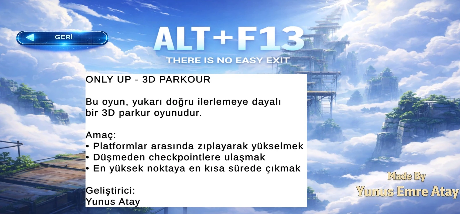 🎮 Projenin Hikayesi ve İlham Kaynağı: Bu projeyi tasarlarken çocukluğumun ve gençliğimin efsanesi CS 1.6 sunucularındaki o meşhur "bunny hop" ve tırmanma parkurlarından ilham aldım. O dönem saatlerce düşmeden yukarı çıkmaya çalıştığımız o mekanikleri, modern "Only Up" konseptiyle birleştirerek kendi yorumumu kattım.