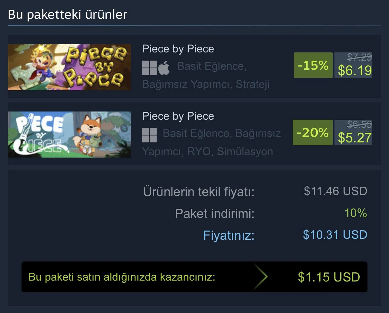 Steam'de aynı ismi taşıyan iki farklı oyun (Piece by Piece) bir gün arayla çıktı. Geliştiriciler telif kavgası yerine dostluğu seçti ve "Piece by Piece Double" paketini %10 indirimle yayınladı 🥳🤝